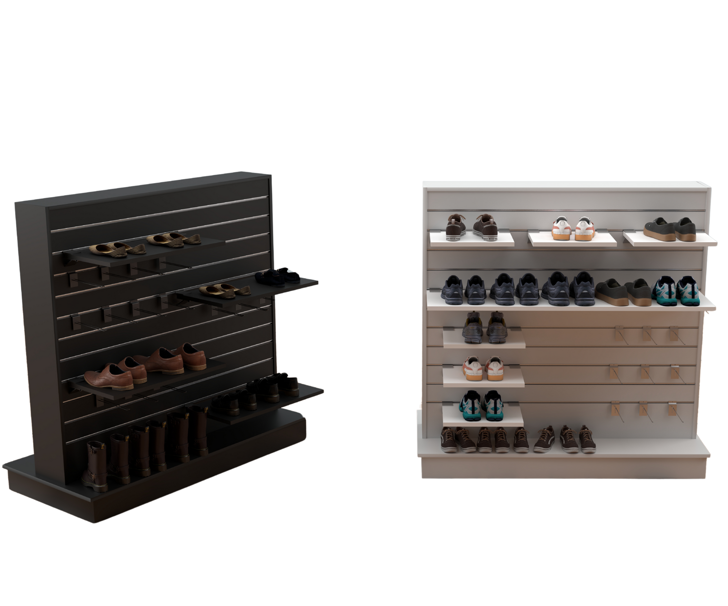 Ces présentoirs à vêtements peuvent accueillir de nombreux types d'étagères et de supports, éliminant ainsi le besoin de cadres personnalisés. Utilisez la gondole à panneaux rainurés comme étagère produit ou pour vendre des accessoires.